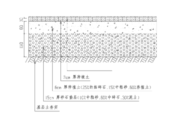 3.设置厚60稳定层(兼作养植层)。稳定层做法为:25%粒径为10-30的碎石、15%中等粗细河砂、60%耕作土并掺入适量有机肥,三者翻拌均匀,摊铺在砂石垫层上,碾压密实,即可作为植草格的基层。